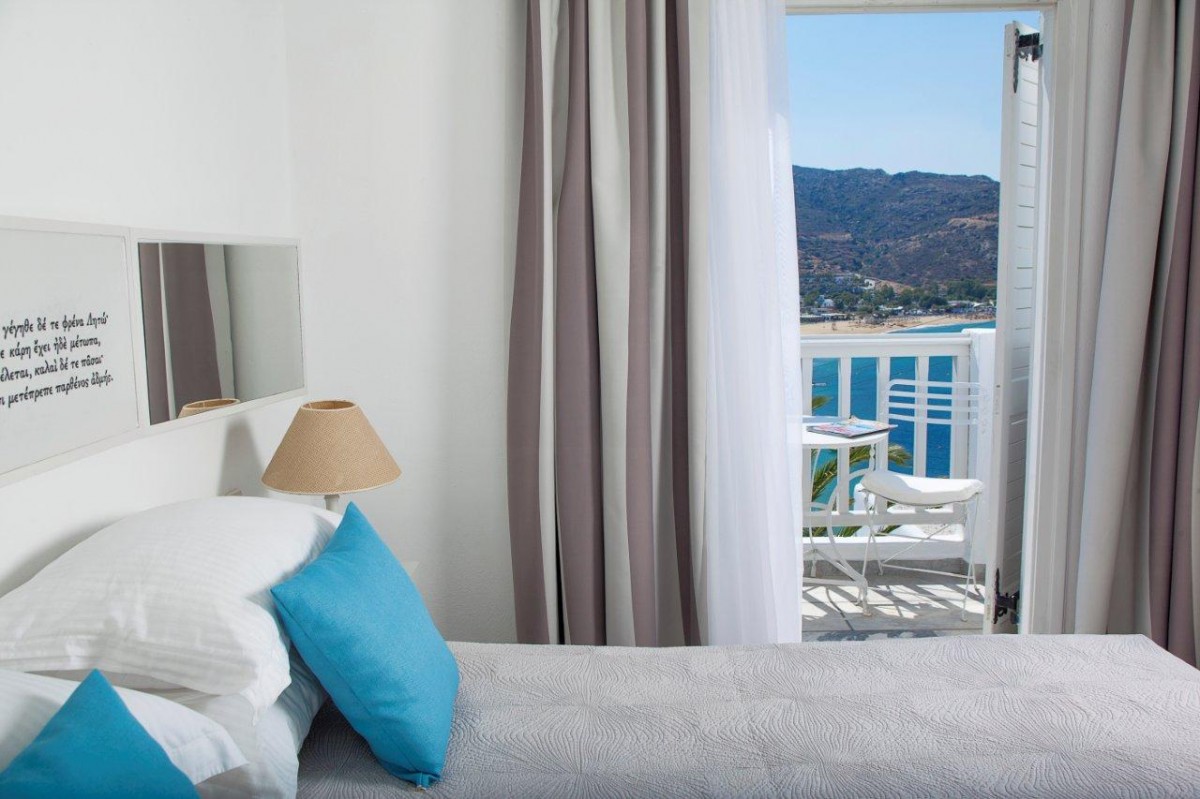Situated on the upper level of the hotel and offering side sea view to the bright blue of the sandy beach of Mylopotas, Double Rooms are your perfect starting point from which you can explore the beauties of Ios. White in abundance is only interrupted by splashes of Aegean colours, making you feel totally connected to the island lifestyle. Also, the lyrics of Homer covering your rooms’ walls make you come closer to the local culture. Double Rooms constitute of one double or twin beds, one bathroom with shower cabin and a balcony with restricted sea view.
