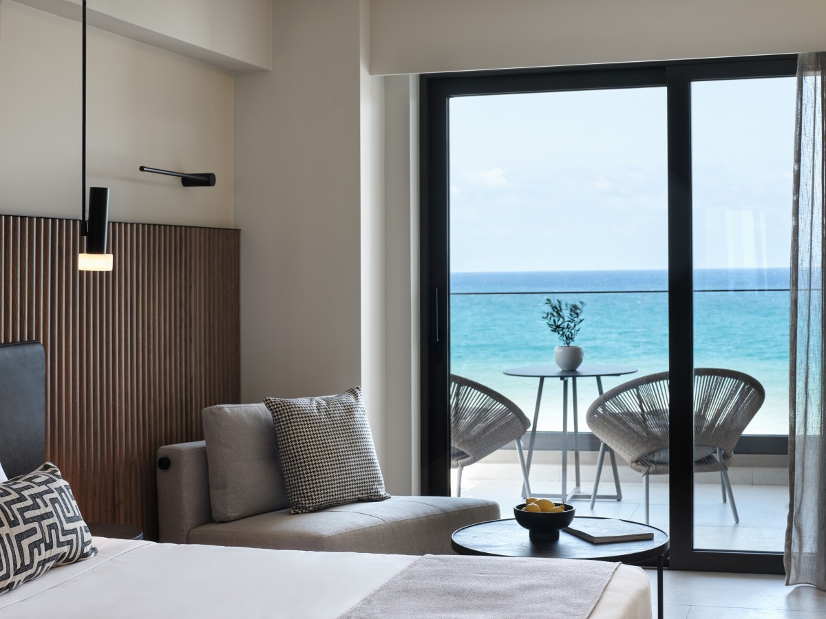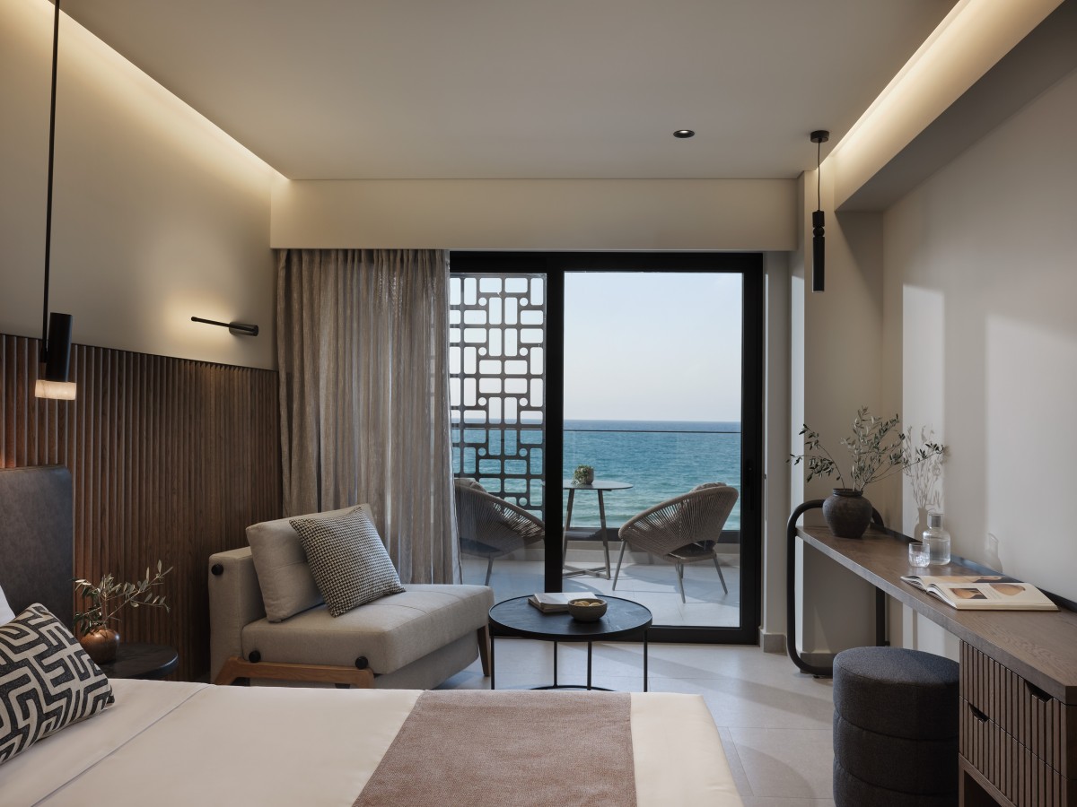 Located on the top floor, the Signature One-Bedroom Suite offers an exquisite and spacious retreat. It is furnished with a luxurious king-size bed and a sofa bed, providing ample space for relaxation. The suite includes a comfortable living room, a private bathroom, and a guest WC. Large windows open to a furnished balcony that offers breathtaking panoramic sea views, creating the perfect environment to unwind and enjoy the stunning coastline. This suite combines elegance and comfort, making it an ideal choice for those seeking a memorable and luxurious stay.